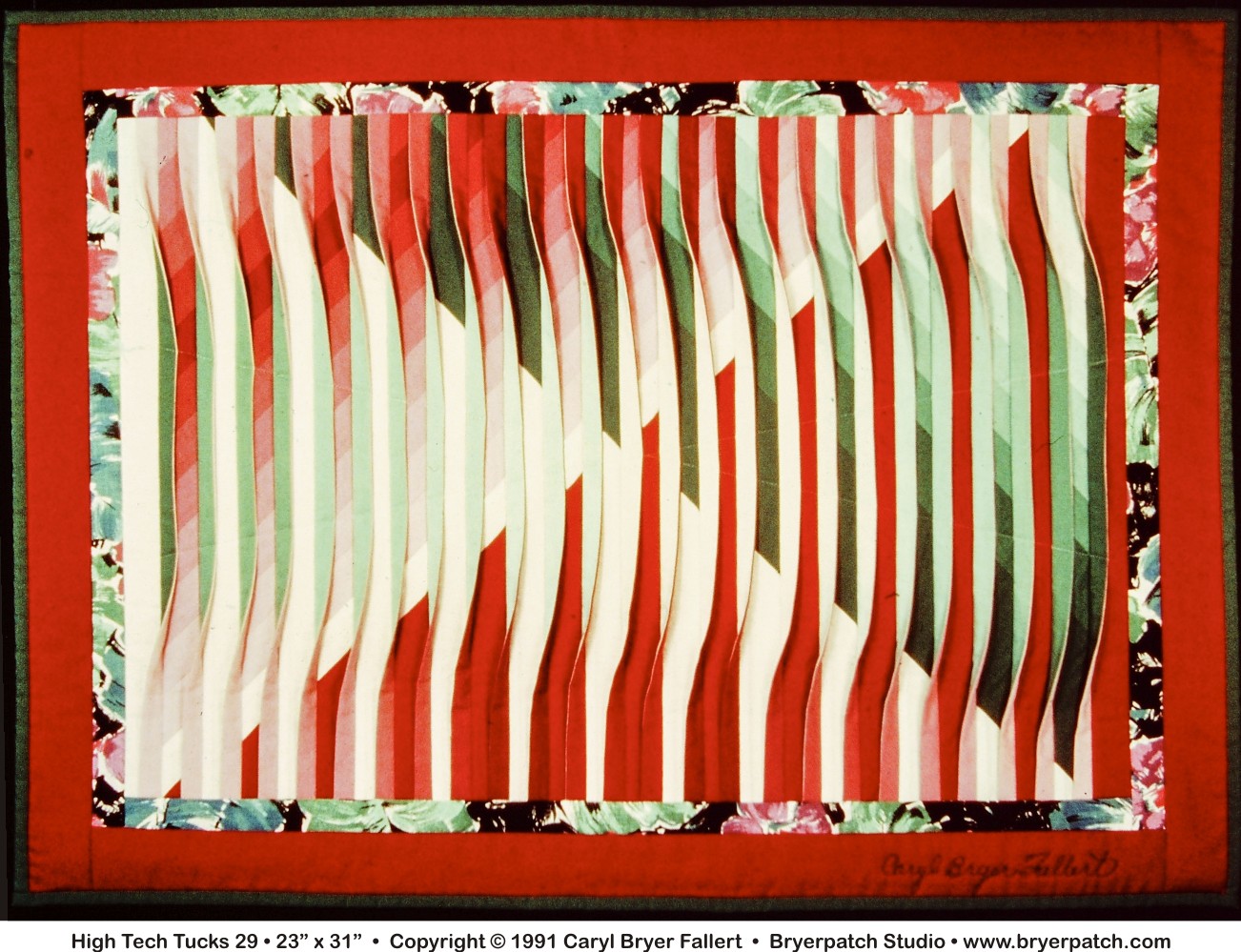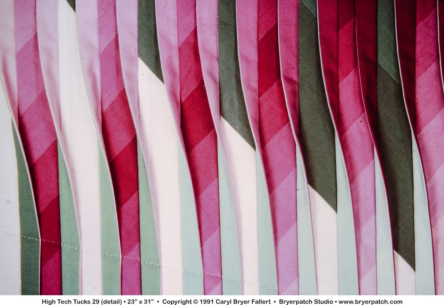 Each of the 1/2" "tucks" was constructed from two different fabrics. One side of the tucks are fabrics dyed in a graduation from light to dark raspberry. The other side of the tucks are gradation from light to dark green. The use of color and value gradations, and the twisting of the tucks from side to side, create the illusion of movement and light across the surface of the quilt. |