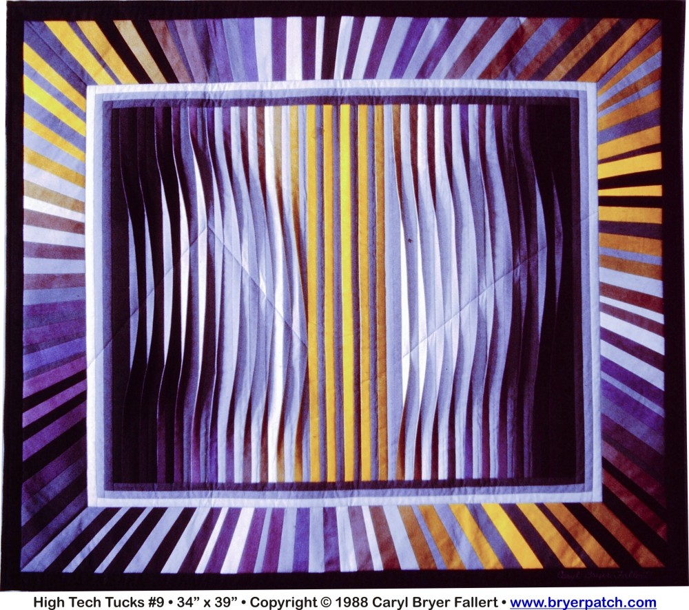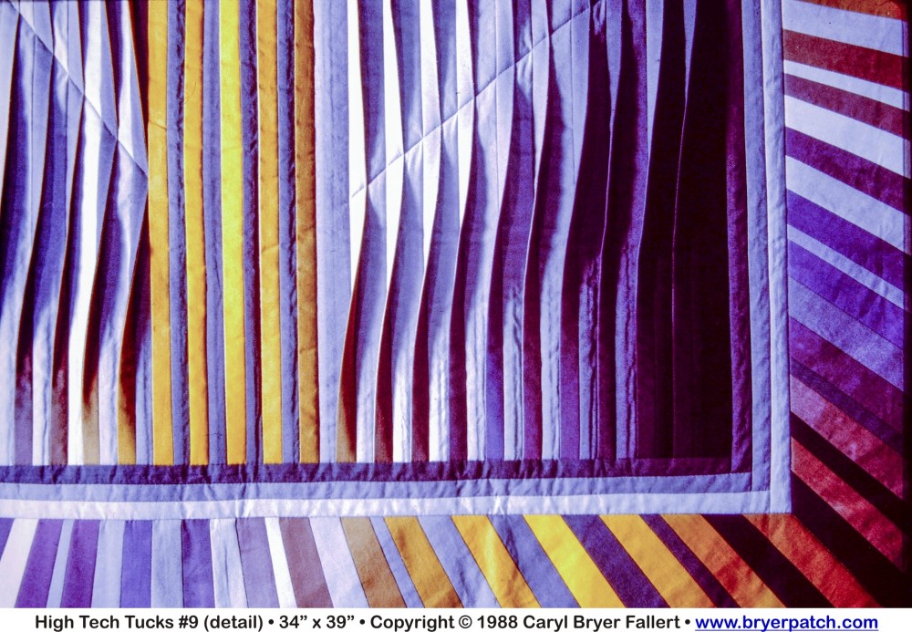 This is one of a series of quilts in which constructed tucks are incorporated into a pieced background.. Color and value gradations and the twisting of the tucks give the illusion of movement over the surface. A second texture is introduced in the slashed panels of graduated color in the top and bottom borders.