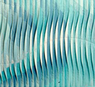 This quilt is a visual expression of the winter snows on the flat open prairies of Northern Illinois. This is also one of a series of quilts in which three dimensional, constructed tucks are incorporated into a pieced background. The fabrics used to piece the background were hand dyed in value (light to dark) gradations of blue and turquoise. The swirling pieced background expresses the idea of the granulated snow, being blown into drifts and dunes in the open fields for days after it falls. The turquoise and blue are the colors of the shadows on the snow drifts, after the sun comes out. The twisting of the tucks, from side to side, and the use of graduated values, creates the illusion of movement, as in the falling and blowing of the snow, during the storm.My use of a traditional quilt block (Grandmother's Flower Garden) on the back of this contemporary art quilt is my tribute to the many anonymous quilt artists of the past. I chose a hexagonal design to echo the geometric structure of snow flakes.