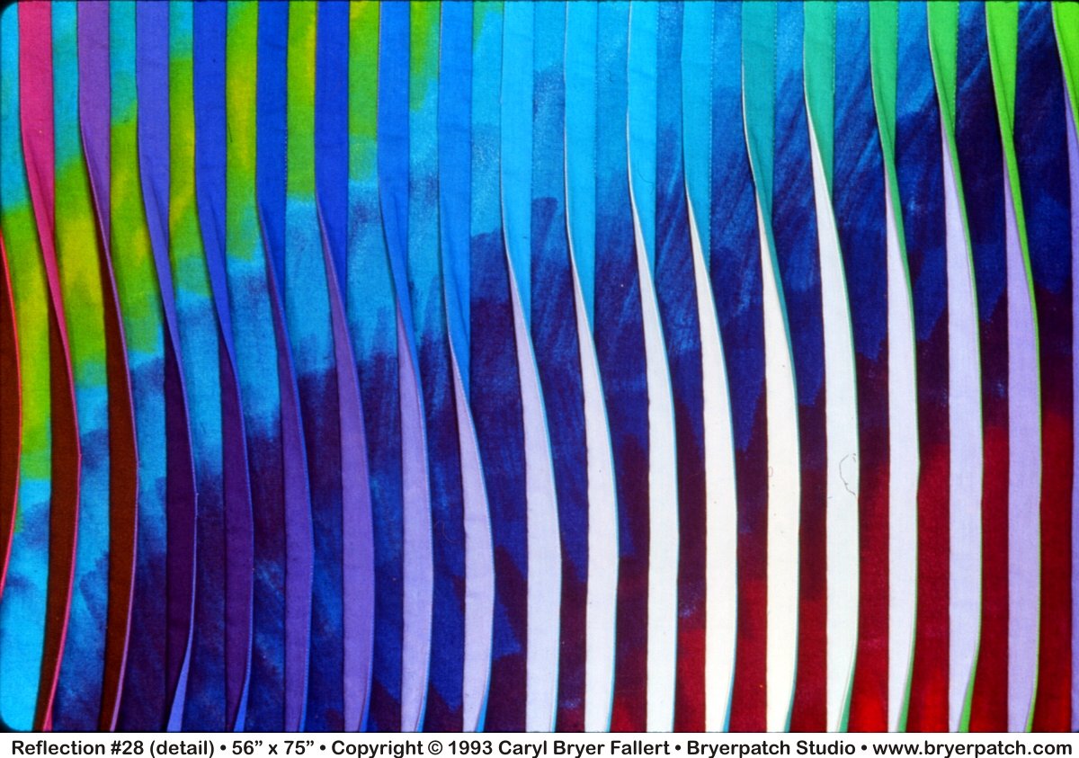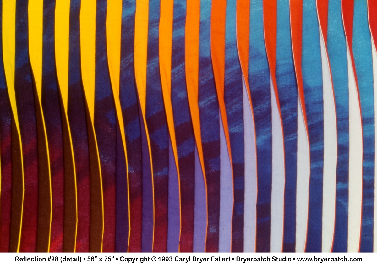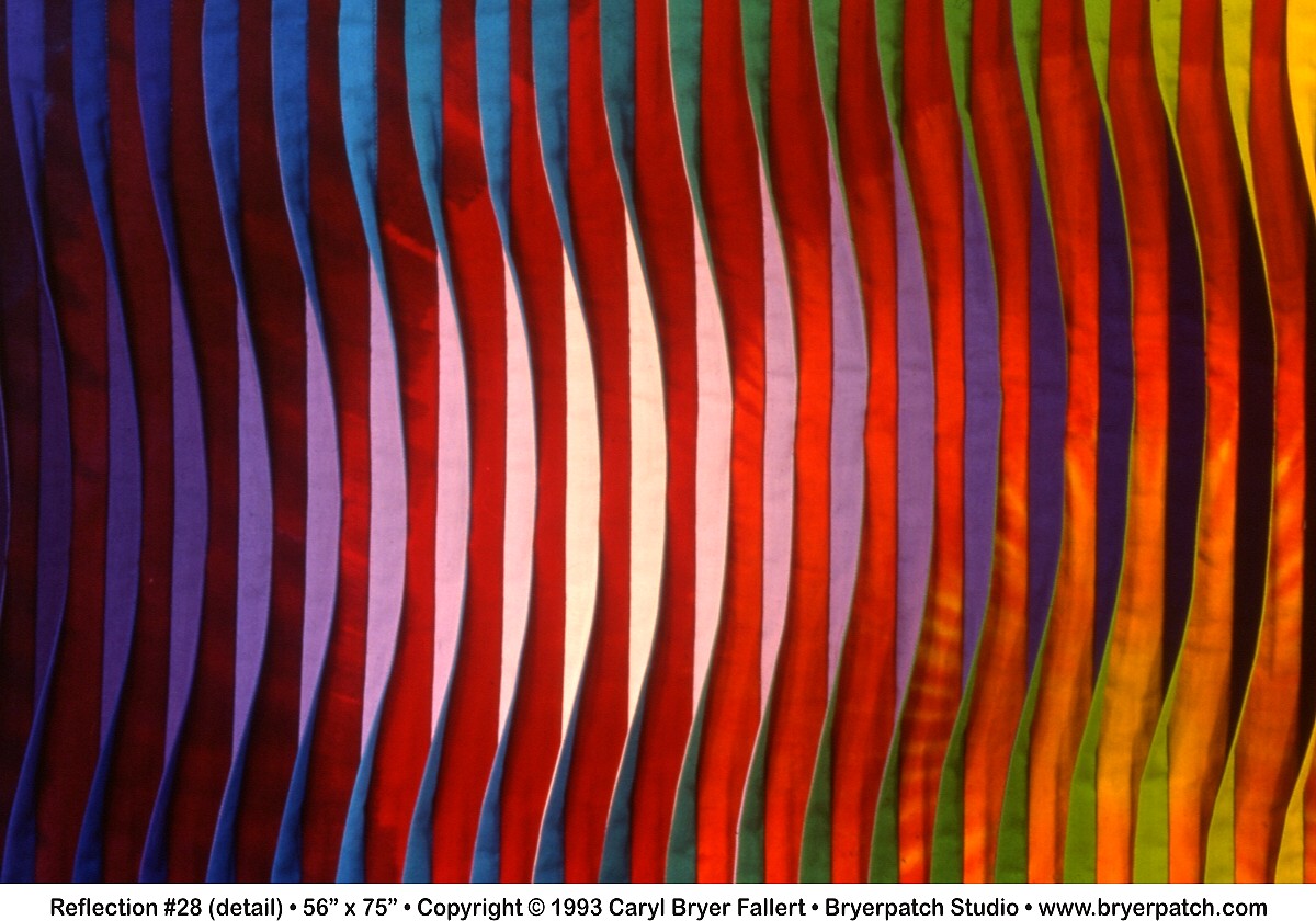 Each of the ½" "tucks" was constructed from two different fabrics. The right sides of the tucks are made from fabrics dyed in a forty-seven-color gradation of pure rainbow hues. The left sides of the tucks graduate from black to deep blue-violet to white. The use of color and value (light to dark) gradations, and the twisting of the tucks from side to side, create the illusion of movement and light across the surface of the quilt. Because different color gradations are used on the right and left sides of the three-dimensional tucks, the appearance of the quilt can be changed significantly by changing your point of view. I like to call the quilts in this series "viewer participation art."